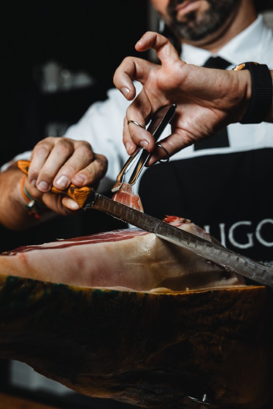 En el jamón con DOP Jabugo apreciaremos, externamente, su caña fina y, en el interior, sus infiltraciones adiposas, su intenso aroma; la untuosidad de su grasa; el sabor personal; y finalmente su intensidad y persistencia en la cavidad retronasal.